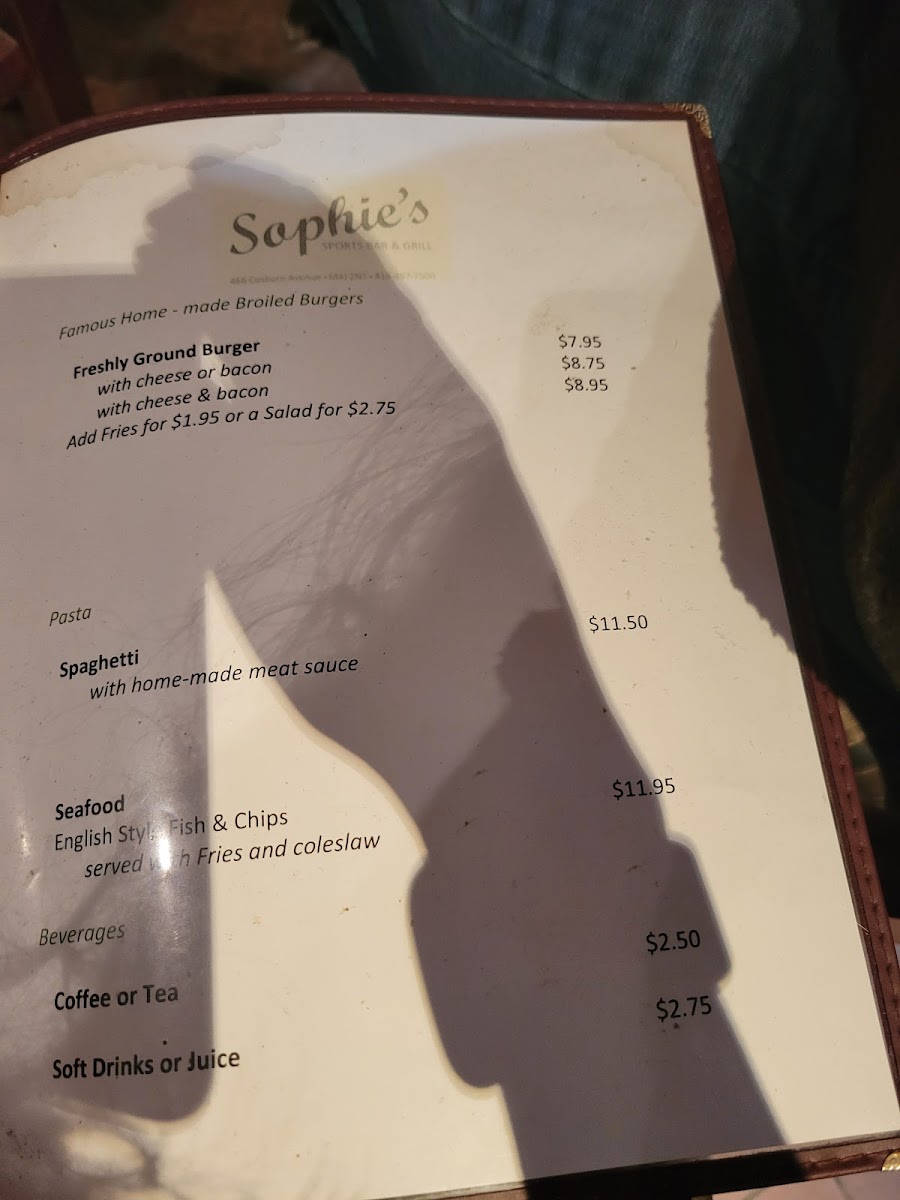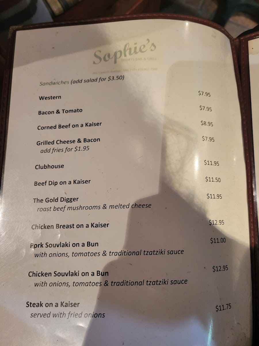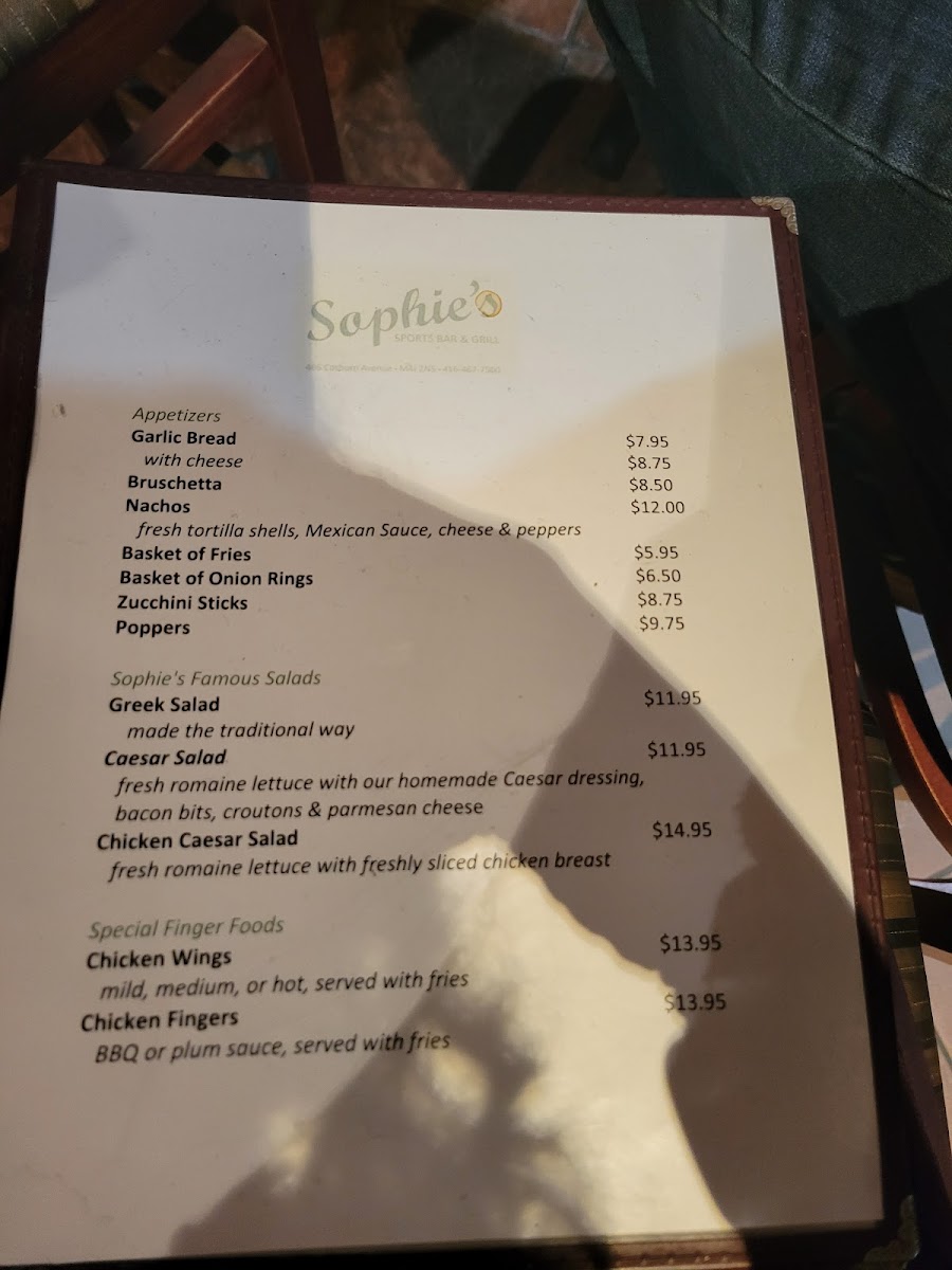 Start your meal with mouthwatering appetizers like Garlic Bread and Nachos, perfect for sharing. Their Sophie's Specials feature standout dishes such as BBQ Spareribs and Chicken Souvlaki, sure to delight even the heartiest appetites. For those seeking lighter options, indulge in their Greek Salad or Chicken Caesar Salad.